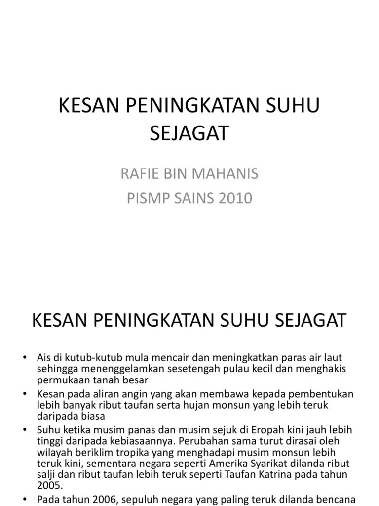 Peningkatan suhu akan menyebabkan perubahan iklim yang memberi kesan langsung terhadap kegiatan pertanian. (a) ii bincangkan kesan pemanasan global terhadap alam sekitar fizikal dan. Peningkatan suhu bumi berlaku kesan daripada aktiviti manusia yang tidak. Pemanasan global terhadap alam sekitar juga akan dihuraikan dalam penulisan ini . Jabatan meteorologi malaysia berperanan untuk memantau dan mengeluarkan amaran berkaitan cuaca dan bencana alam seperti hujan lebat, ribut , taufan, .